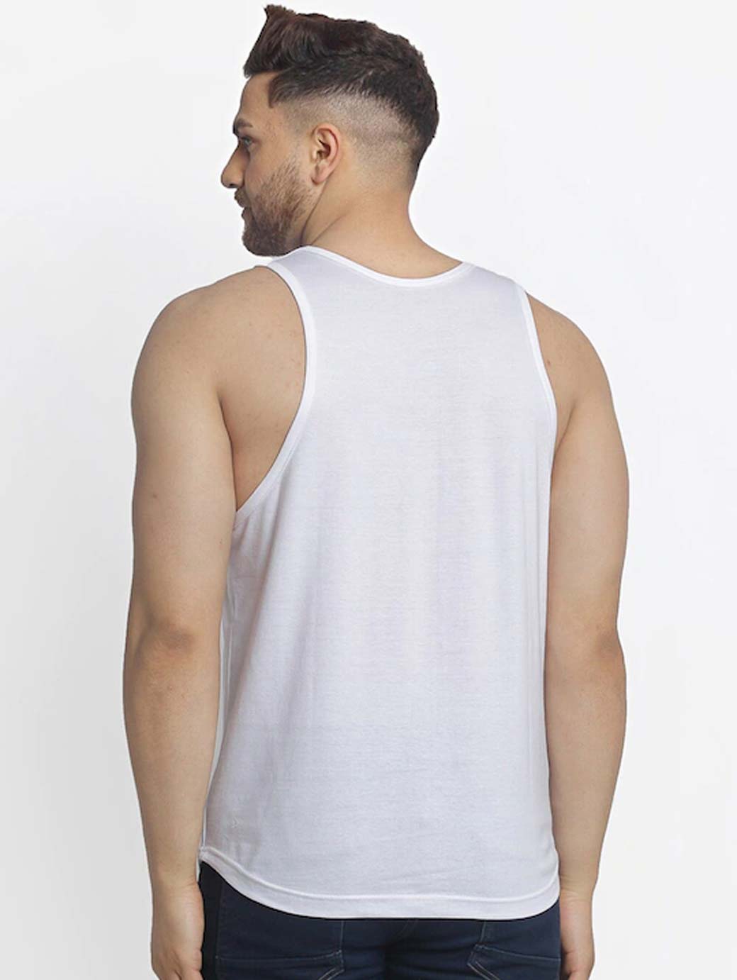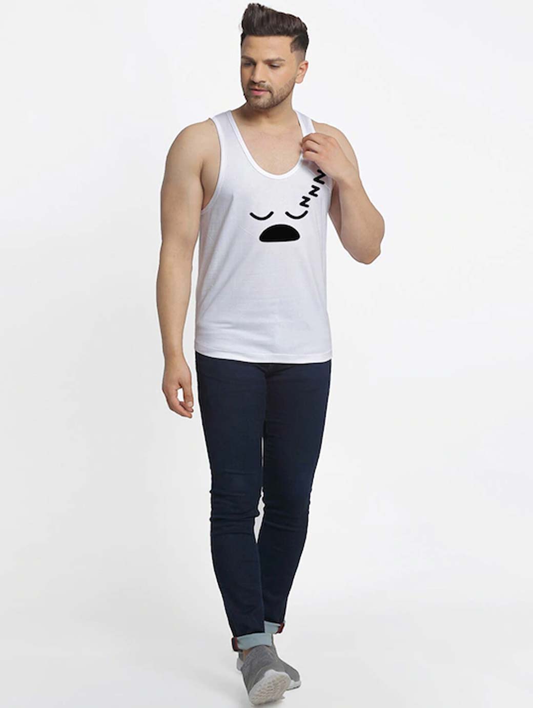 Innerwear gym vests White and black sleepy printed innerwear vest, has a round neck, sleeveless White and grey , has a round neck, sleeveless .