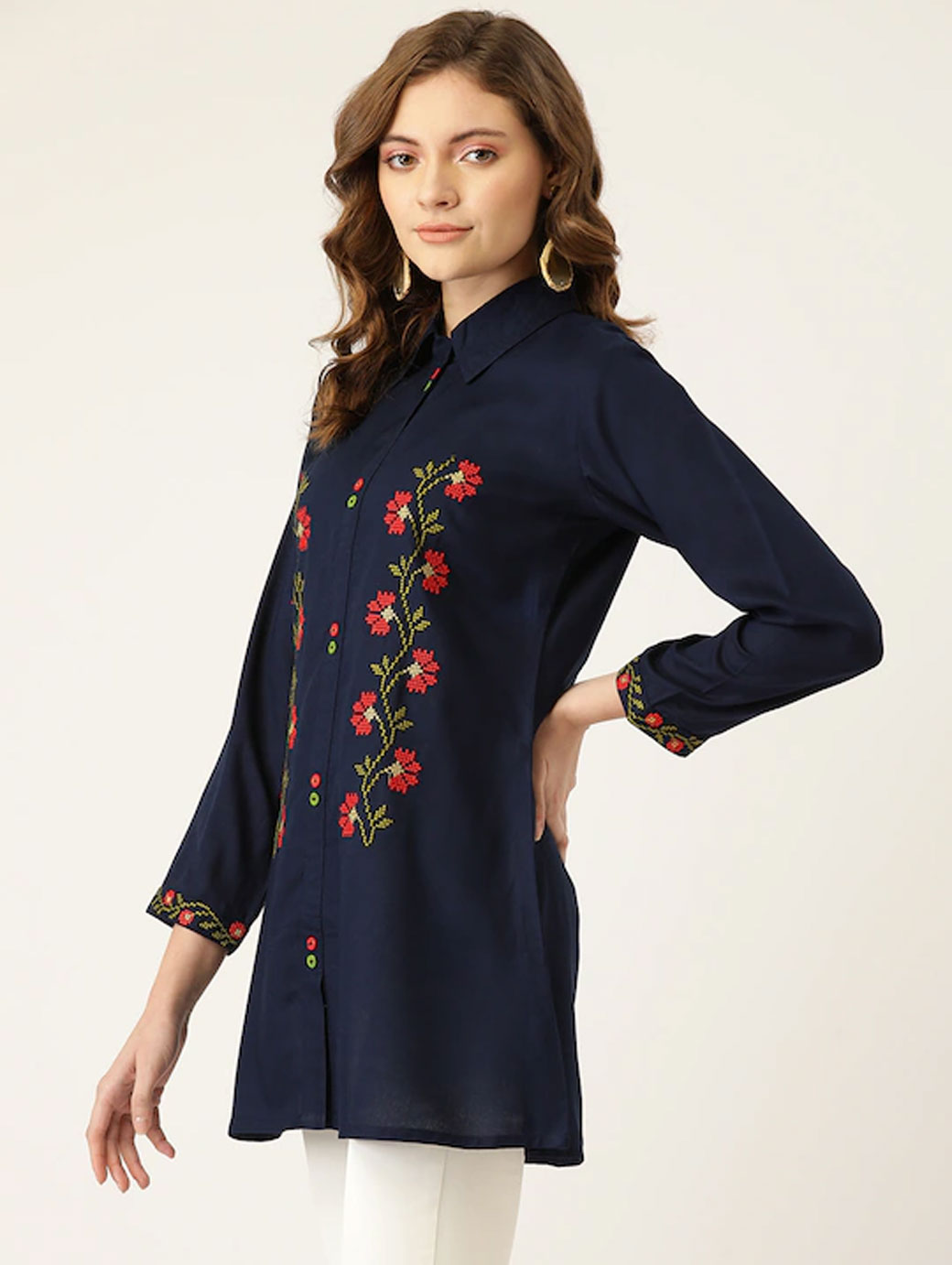 Navy blue embroidered tunic, has a shirt collar, three-quarter sleeves, embroidered.
