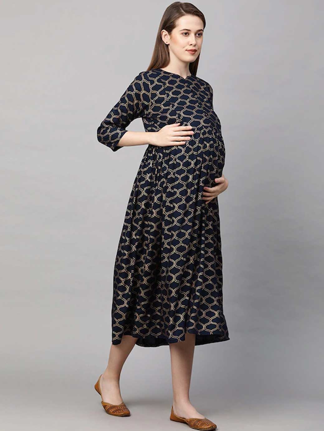 Navy Blue & Gold-Toned Geometric Printed Maternity Nursing A-Line Midi Dress