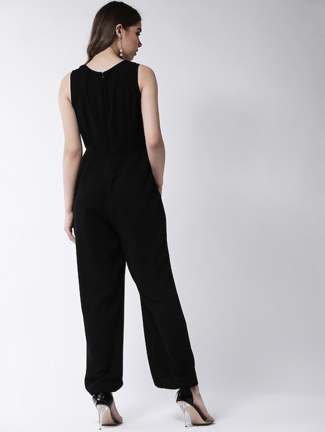 Black solid basic jumpsuit, has a V-neck, sleeveless, concealed zip closure