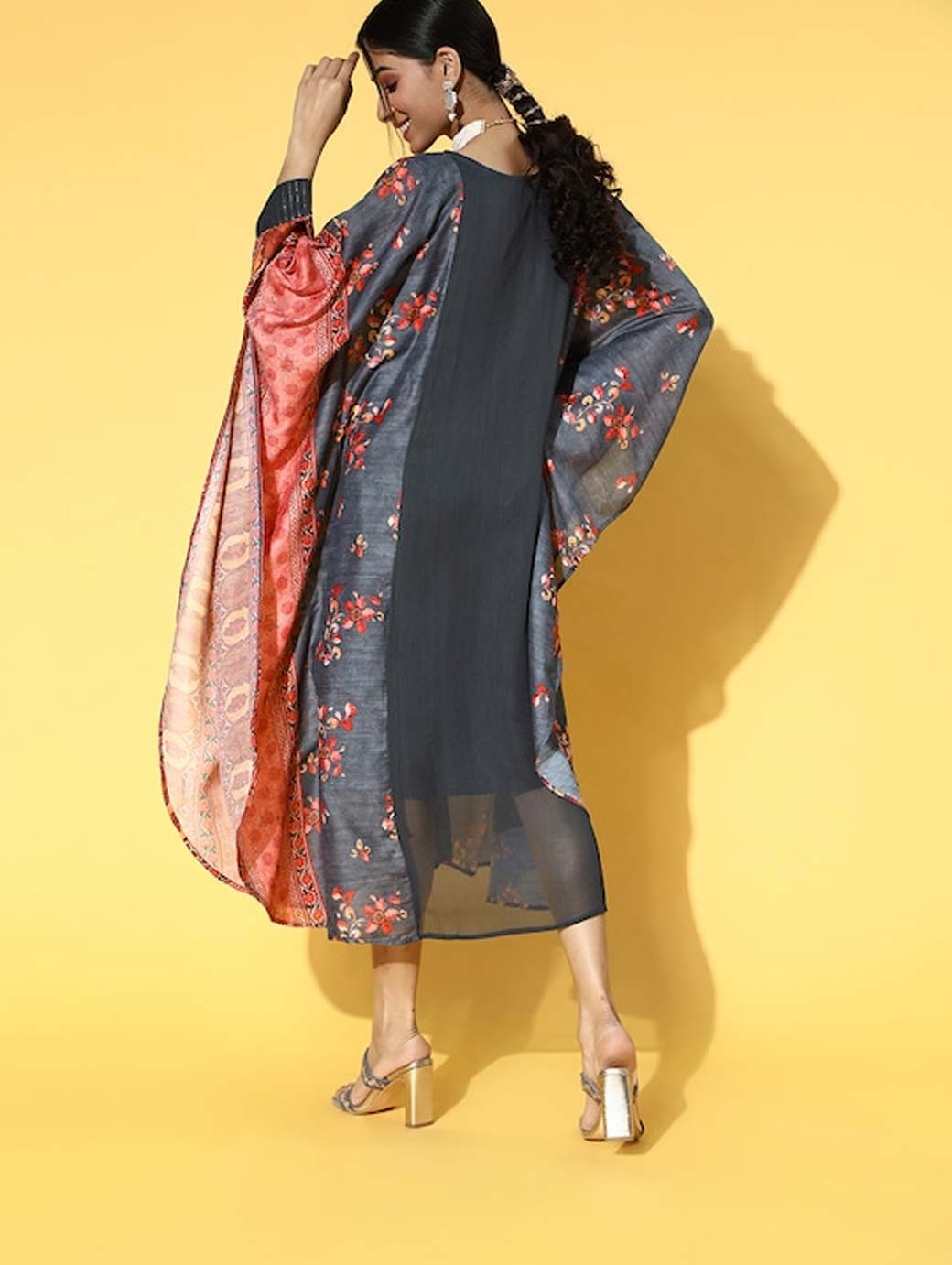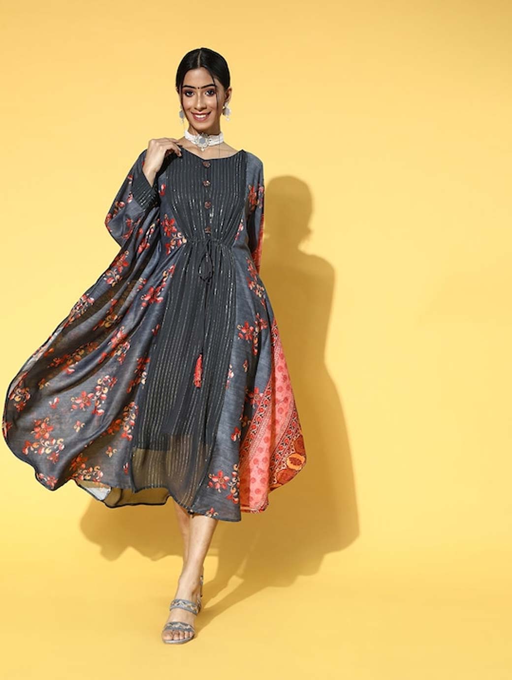 Designed to impress, this modish dress is ideal for any occasion. Crafted with a beautiful ethnic motifs print and round neck, this dress will elevate your appeal. Charcoal shade Beautiful ethnic motifs print Round neck Three-quarter kimono sleeves Cotton, hand wash Trend Alert With gathered volumes, tiers, pleats, bias drapes, and swaying silhouettes, the swirling volumes trend is a mix of whimsical and playful femininity. It plays with beautiful prints and patterns, such as floral, pastel colour-blocking, embroidered, Nu Noheme, floral all-over print, ombre, rich gold foil print, porcelain blooms, and so on.