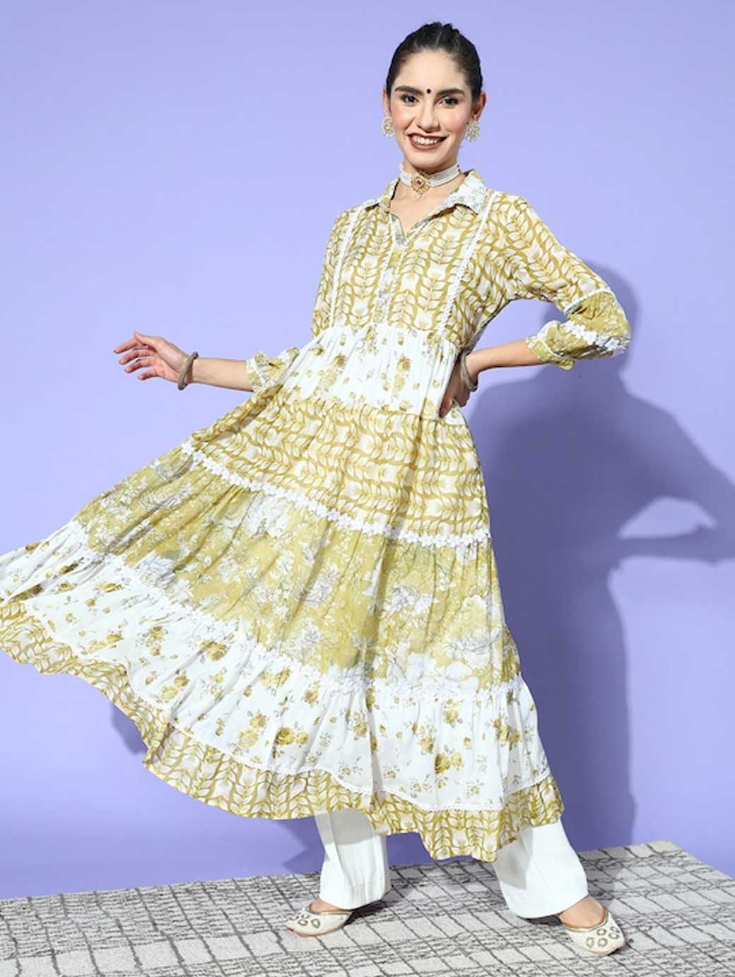 Become a trendsetter when you walk out of the house in this kurta. Designed with an alluring flared hemline and ankle length, this attractive kurta will lend you a traditional look. Elegant olive shade Three-quarter puff sleeves Flared hemline Ankle length Cotton, dry clean Trend Alert With gathered volumes, tiers, pleats, bias drapes, and swaying silhouettes, the swirling volumes trend is a mix of whimsical and playful femininity. It plays with beautiful prints and patterns, such as floral, pastel colour-blocking, embroidered, Nu Noheme, floral all-over print, ombre, rich gold foil print, porcelain blooms, and so on.
