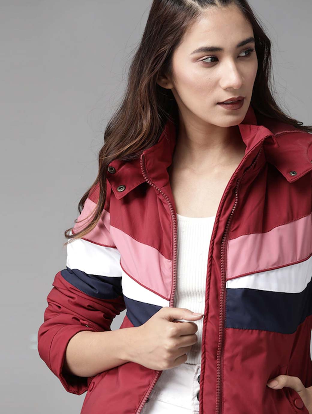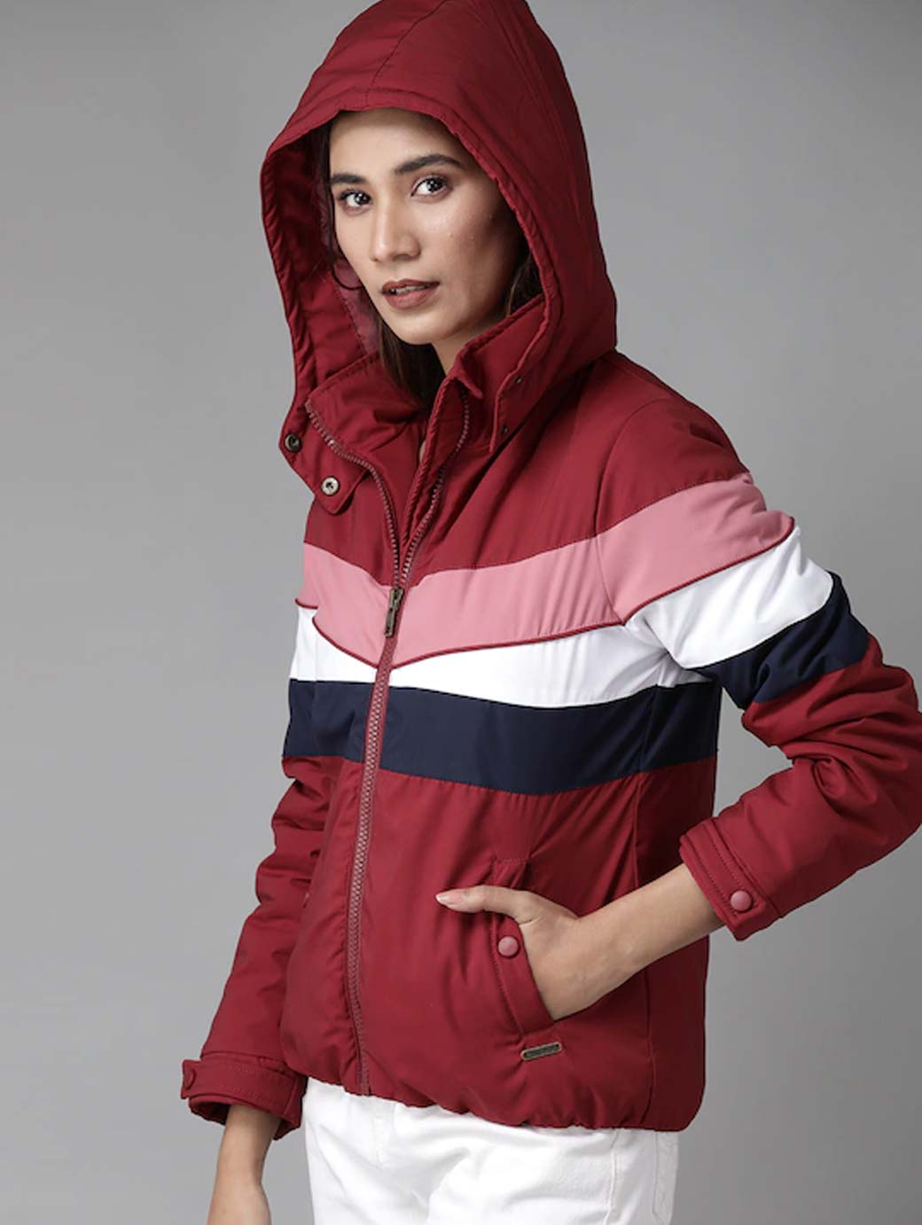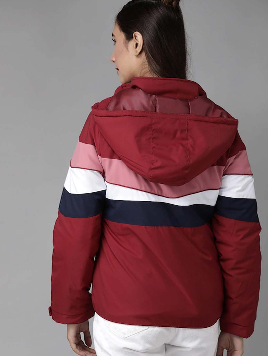 Women Maroon & Navy Blue Striped Hooded Padded Jacket
