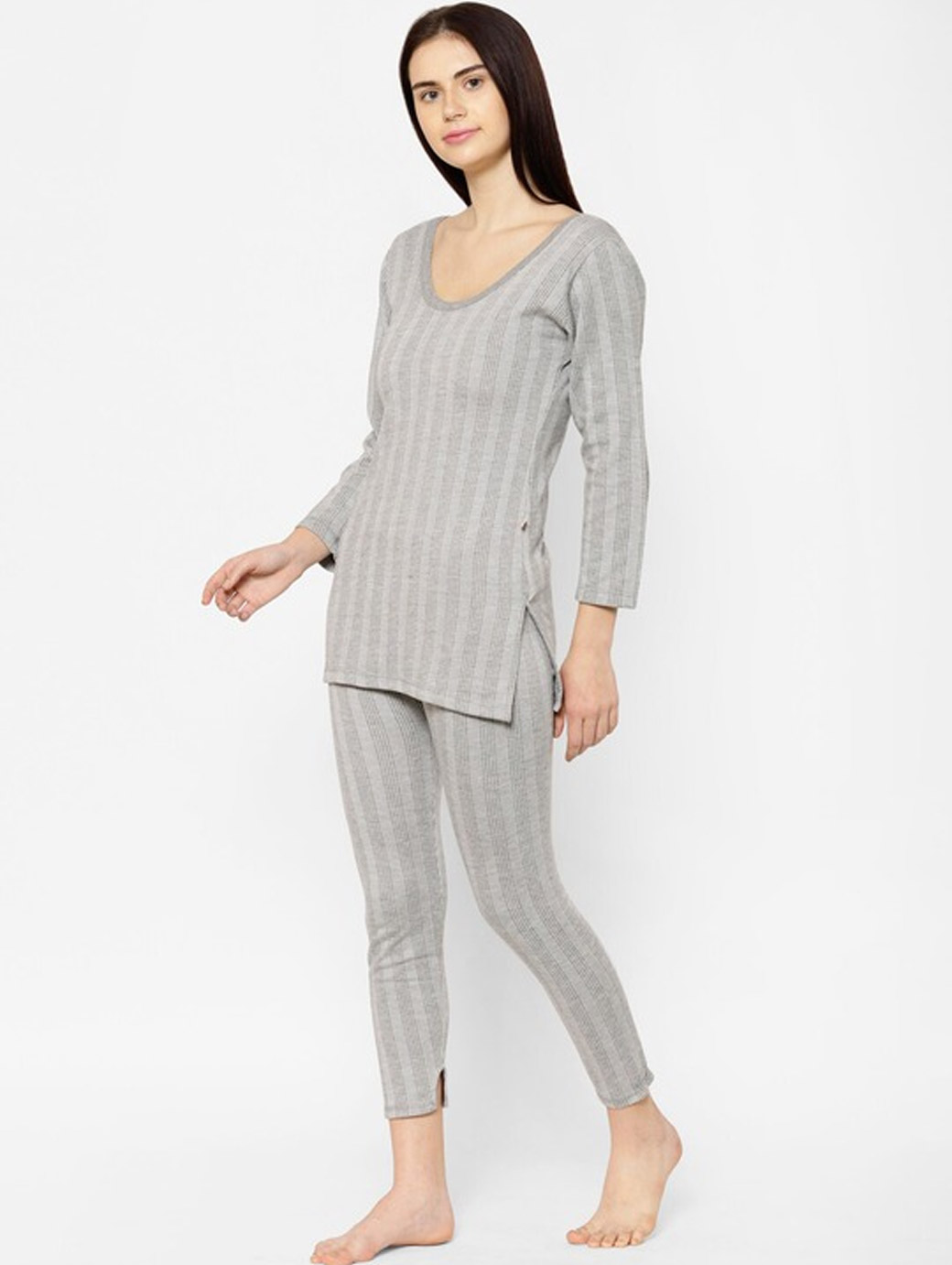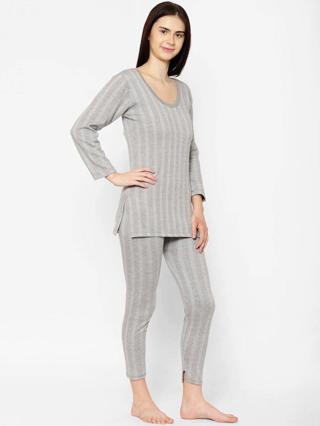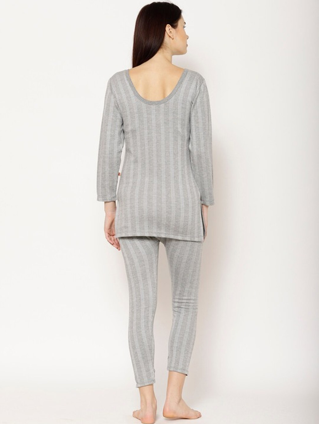 Grey striped thermal set consists of a thermal top and thermal bottom